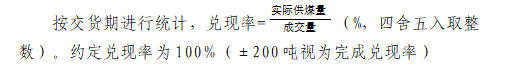 (一)銷方因自身原因?qū)е聝冬F(xiàn)率低于100%,除按質(zhì)量考核條款考核外,還將進(jìn)行兌現(xiàn)率考核,考核金額=成交量×(100%-兌現(xiàn)率)×成交價(jià)×5%,從保證金中扣除。