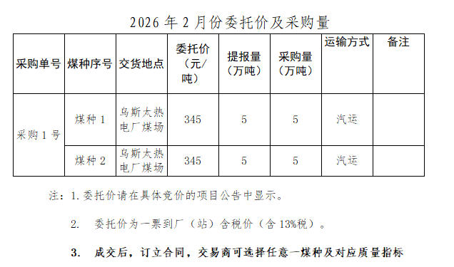 內(nèi)蒙古能源集團有限公司計劃對所屬烏斯太熱電廠2026年2月市場煤采購進行電子專場交易,交易信息現(xiàn)對外公開發(fā)布,凡符合條件的交易商均可參加。