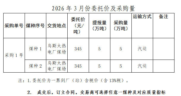 內(nèi)蒙古能源集團有限公司計劃對所屬烏斯太熱電廠2026年3月市場煤采購進行電子專場交易,交易信息現(xiàn)對外公開發(fā)布,凡符合條件的交易商均可參加。